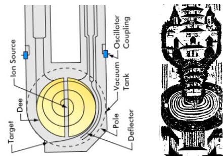 Presented here is a comparison of the base of the Meru drawing with a plan for a cyclotron, an early 20th century particle accelerator designed by Ernest O. Livermore in 1929 and developed in the early 1930s (coincident with America’s shift to a technologically based society). The cyclotron was a necessary technology used in the splitting of the atom and the development of the A-bomb.