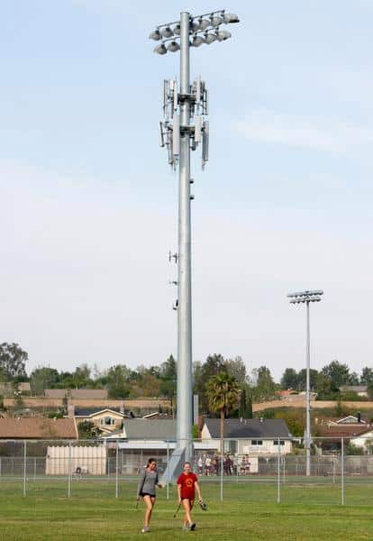 The cell phone tower at Esperanza High School in Anaheim is on a light pole between the school’s football and baseball fields. The Placentia Yorba Linda Unified is allowing phone companies to put up cell towers on school grounds to make extra money.